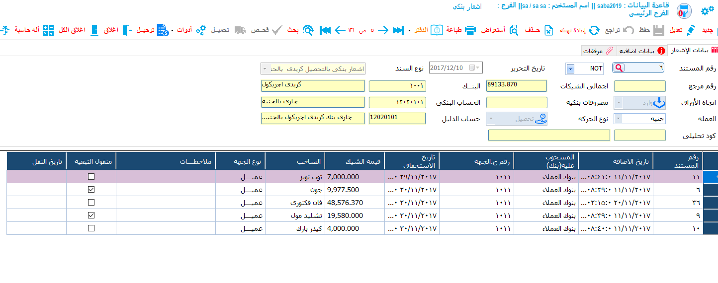 - شاشة لعمل الأشعار البنكي الذي يفيد تحصيل الشيك أو ارتداد الشيك